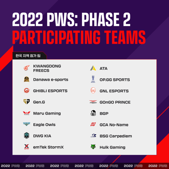PWS: ÆäÀÌÁî2¿¡´Â Çѱ¹, ÀϺ», Â÷ÀÌ´ÏÁî ŸÀÌÆäÀÌ/È«Äá/¸¶Ä«¿ÀÀÇ ÃÖÁ¤»ó ±â·®À» °®Ãá 48°³ ÆÀµéÀÌ ÃâÀüÇÑ´Ù. Çѱ¹¿¡¼´Â Gen.G, KWANGDONG FREECS, Danawa e-sports, DWG KIA µî 16°³ ÆÀÀÌ Âü°¡ÇÑ´Ù. À̵éÀº 6ÁÖ°£ ÃÑ»ó±Ý 1¾ï 9õ5¹é¸¸ ¿ø°ú ±Ç¿ªº° ´ëȸÀÎ ¡®ÆàÁö ÄÜÆ¼³ÙÅ» ½Ã¸®Áî(PUBG Continental Series, ÀÌÇÏ PCS) 7¡¯ ƼÄÏÀ» µÎ°í Ä¡¿ÇÑ ½ÂºÎ¸¦ ÆîÄ¥ ¿¹Á¤ÀÌ´Ù.