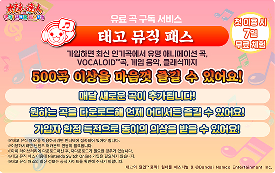À¯·á °î ±¸µ¶ ¼ºñ½º 'ÅÂ°í ¹ÂÁ÷ ÆÐ½º'¿¡ °¡ÀÔÇϸé, º»Æí¿¡ ¼ö·ÏµÈ °î¿¡ Ãß°¡·Î ÃֽŠÀαâ°îºÎÅÍ À¯¸íÇÑ ¾Ö´Ï¸ÞÀÌ¼Ç °î, VOCALOID¢â°î, °ÔÀÓ À½¾Ç, Ŭ·¡½Ä±îÁö 500°î ÀÌ»óÀ» ¸¶À½²¯ Áñ±æ ¼ö ÀÖ´Ù. ¸Å´Þ »õ·Î¿î °îÀÌ ¶óÀξ÷¿¡ Ãß°¡µÇ¸ç, °¡ÀÔÀÚ ÇÑÁ¤ ƯÀüÀ¸·Î µ¿ÀÌÀÇ ÀÇ»óÀ» ¹ÞÀ» ¼ö ÀÖ´Ù.