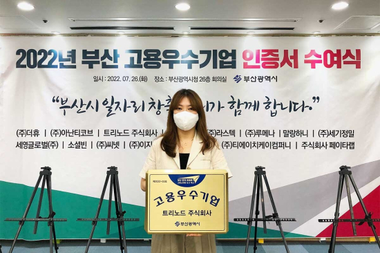 Æ®¸®³ëµå´Â Áö³ 26ÀÏ ¿ÀÈÄ 4½Ã ºÎ»ê½Ãû 1Ãþ ´ëȸÀǽǿ¡¼ ÁøÇàµÈ 2022³â °í¿ë ¿ì¼ö±â¾÷ ÀÎÁõ¼ ¼ö¿©½Ä¿¡¼ À̹ÌÁÖ ´ëÇ¥°¡ ºÎ»ê½Ã·ÎºÎÅÍ ÀÎÁõ¼¸¦ ¼ö¿©Çß´Ù.