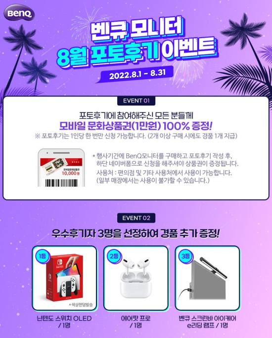 8¿ù Æ÷ÅäÈıâ À̺¥Æ®´Â º¥Å¥ ¸ð´ÏÅÍ Àü ¶óÀξ÷À» ´ë»óÀ¸·Î ¸ð´ÏÅ͸¦ ±¸ÀÔÇÏ°í »çÁøÀ» Æ÷ÇÔÇÑ ±¸¸ÅÈı⸦ ÀÛ¼ºÇÑ ¸ðµç ºÐµé¿¡°Ô ¸ð¹ÙÀÏ ¹®È»óǰ±Ç(1¸¸¿ø±Ç)À» ÁõÁ¤Çϰí, Æ÷ÅäÈı⠿ì¼öÈıâÀÚ·Î ¼±Á¤µÈ 3¸í¿¡°Ô´Â ´ÑÅÙµµ ½ºÀ§Ä¡ OLED¿Í ¾ÖÇà ¿¡¾îÆÌ ÇÁ·Î, ´«ÀÌ ÆíÇÑ ¸ð´ÏÅÍÁ¶¸í ¡®º¥Å¥ ½ºÅ©¸°¹Ù ¾ÆÀÌÄɾî e¸®µù ·¥ÇÁ¡¯¸¦ Ãß°¡·Î ÁõÁ¤ÇÏ´Â Çà»çÀÌ´Ù.