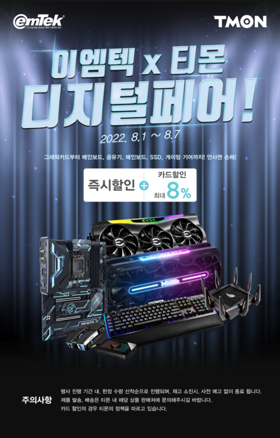 Ƽ¸ó µðÁöÅÐÆä¾î¿¡¼´Â ÀÌ¿¥ÅØÀÇ Ãßõ Á¦Ç°µéÀ» Áï½Ã ÇÒÀÎ ÄíÆù Àû¿ë¿¡ ƯÁ¤ Á¦ÈÞ»ç Ä«µå ÃÖ´ë 8% ÇÒÀαîÁö ´õÇØ, Å« ÆøÀÇ ÇÒÀÎ ÇýÅÃÀ» ¸¸³ªº¼ ¼ö ÀÖ´Ù. ´ëÇ¥ ±×·¡ÇÈÄ«µå Á¦Ç°À¸·Î´Â ÀÌ¿¥ÅØ ÁöÆ÷½º RTX 3080 Ti, 3070 Ti BLACK Edition ½Ã¸®Á ºñ·ÔÇÑ, ÀÌ¿¥ÅØ ÁöÆ÷½º RTX 3060 Ti, 3050 STORM X Dual ½Ã¸®Áî, EVGA ÁöÆ÷½º RTX 3090 Ti ½Ã¸®ÁîºÎÅÍ RTX 3050 ½Ã¸®Áî µîÀÌ ÆÇ¸Å µÈ´Ù.