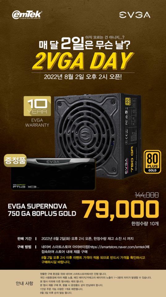 ÀÌ¿¥ÅؾÆÀÌ¿£¾¾´Â 2022³â 8¿ù 2ÀÏ ¿ÀÈÄ 2½ÃºÎÅÍ [2VGA DAY]¸¦ ¸ÂÀÌÇÏ¿© ³×À̹ö ½º¸¶Æ®½ºÅä¾î ¾ÆÀ̹ÙÀÌÄÄ¿¡¼ EVGA SUPERNOVA 750 GA 80PLUS GOLD¸¦ 79,000¿ø¿¡ ÇÑÁ¤¼ö·® 10°³ Ư°¡ ÆÇ¸ÅÇÑ´Ù ¹àÇû´Ù.