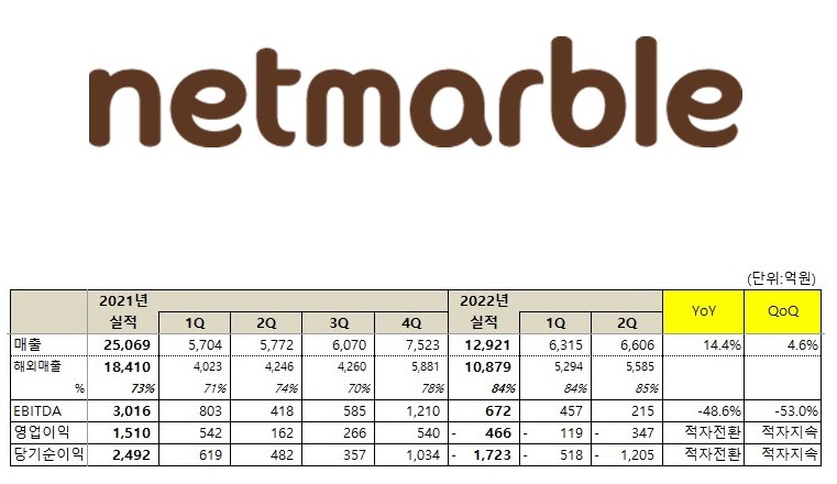 ³Ý¸¶ºíÀº ¿ÃÇØ 2ºÐ±â ¿¬°á±âÁØÀ¸·Î ¸ÅÃâ 6,606¾ï¿ø(YoY 14.4%, QoQ 4.6%), EBITDA(»ó°¢Àü ¿µ¾÷ÀÌÀÍ) 215¾ï¿ø(YoY -48.6%, QoQ -53.0%), ¿µ¾÷¼Õ½Ç 347¾ï¿ø(YoY ÀûÀÚÀüȯ, QoQ ÀûÀÚÁö¼Ó), ´ç±â¼ø¼Õ½Ç 1,205¾ï¿ø(YoY ÀûÀÚÀüȯ, QoQ ÀûÀÚÁö¼Ó)À» ±â·ÏÇß´Ù°í 11ÀÏ ¹àÇû´Ù.