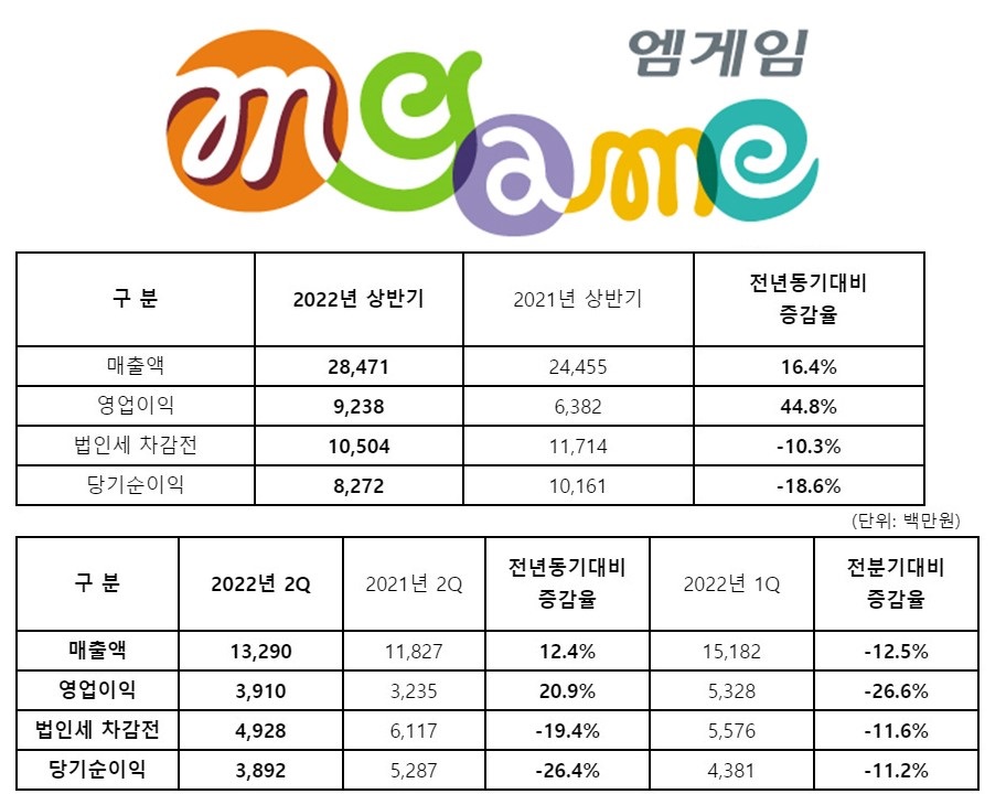 ¿¥°ÔÀÓÀº 2022³â »ó¹Ý±â ¿¬°á ±âÁØ ¸ÅÃâ 285¾ï¿ø, ¿µ¾÷ÀÌÀÍ 92¾ï¿ø, ´ç±â¼øÀÌÀÍ 83¾ï¿øÀ» ´Þ¼ºÇß´Ù°í 16ÀÏ ¹ßÇ¥Çß´Ù.