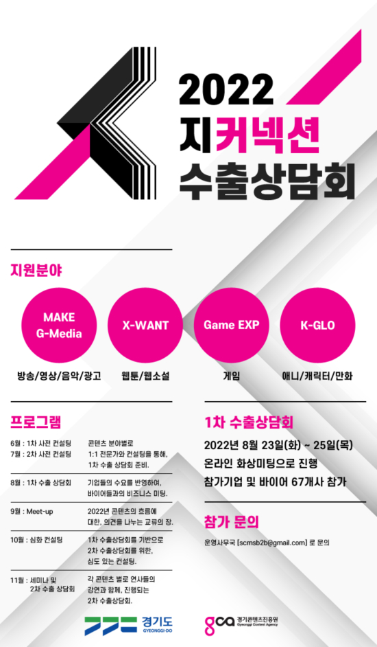 À̹ø ¡®2022 ÁöÄ¿³Ø¼Ç ¼öÃâ»ó´ãȸ¡¯´Â ÄÜÅÙÃ÷ ±â¾÷ÀÇ ¼º°øÀûÀÎ ºñÁî´Ï½º °è¾à ¹× ÇØ¿Ü ³×Æ®¿öÅ© È®´ë¸¦ À§ÇÑ Çà»çÀÌ´Ù. ¼öÃâ»ó´ãȸ´Â ¡âGameEXP(°ÔÀÓ) ¡âK-GLO(¾Ö´Ï¸ÞÀ̼Ç/¸¸È/ij¸¯ÅÍ) ¡âX-WANT(À¥Å÷/À¥¼Ò¼³) ¡âMAKE-G(¹æ¼Û/¿µ»ó/À½¾Ç/±¤°í) µî 4°³ ¼½¼ÇÀ¸·Î ±¸ºÐÇÏ¿© »çÀü¿¡ ¸ÅĪµÈ ÄÜÅÙÃ÷ ±â¾÷°ú ¹ÙÀÌ¾î °£ÀÇ ¿Â¶óÀÎ È»ó¹ÌÆÃÀ¸·Î ÁøÇàÇÑ´Ù.