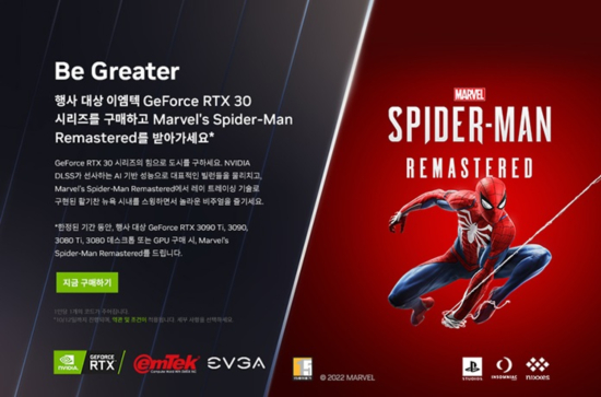 ÀÌ¿¥ÅؾÆÀÌ¿£¾¾´Â 2022³â 9¿ù 7ÀϺÎÅÍ 10¿ù 12ÀϱîÁö, ÀÌ¿¥ÅØ, EVGA ÁöÆ÷½º RTX 3080 ½Ã¸®Áî ÀÌ»ó ±×·¡ÇÈÄ«µå Á¦Ç° ¶Ç´Â ÇØ´ç ±×·¡ÇÈÄ«µå°¡ ÀåÂøµÈ µ¥½ºÅ©Åé ¿ÏÁ¦ PC¸¦ ±¸¸ÅÇϽô °í°´´ÔµéÀ» ´ë»óÀ¸·Î ¡®Be Greater¡¯ ŸÀÌÆ²ÀÎ ¡®Marvel¡¯s Spider-Man Remastered¡¯ ¹øµé ÇÁ·Î¸ð¼ÇÀ» ÁøÇàÇÑ´Ù°í ¹àÇû´Ù.