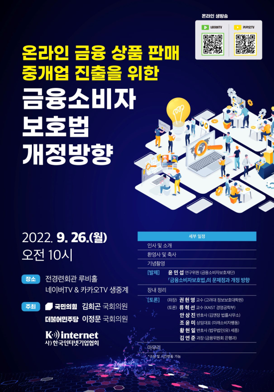 Çѱ¹ÀÎÅͳݱâ¾÷Çùȸ´Â ±¹¹ÎÀÇÈû ±èÈñ°ï ÀÇ¿ø, ´õºÒ¾î¹ÎÁÖ´ç ÀÌÁ¤¹® ÀÇ¿ø°ú °øµ¿À¸·Î 9¿ù 26ÀÏ ¿ù¿äÀÏ ¿ÀÀü 10½Ã, Àü°æ·Ãȸ°ü ·çºñȦ¿¡¼ "¿Â¶óÀÎ ±ÝÀ¶»óǰ ÆÇ¸ÅÁß°³¾÷ ÁøÃâÀ» À§ÇÑ ±ÝÀ¶¼ÒºñÀÚº¸È£¹ý °³Á¤¹æÇâ" Åä·Ðȸ¸¦ °³ÃÖÇÑ´Ù.