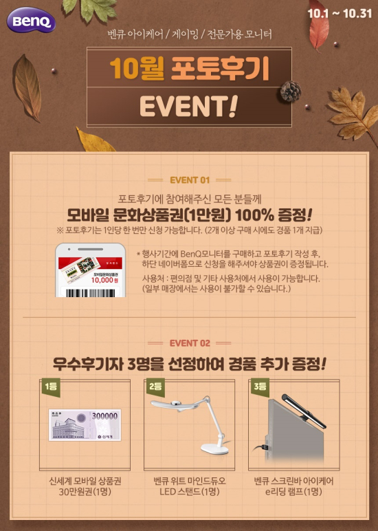 À̹ø Æ÷ÅäÈıâ´Â 10¿ù ÇÑ ´Þ °£ º¥Å¥ ¸ð´ÏÅ͸¦ ±¸ÀÔÇÏ°í »çÁøÀ» Æ÷ÇÔÇÑ ±¸¸ÅÈı⸦ ÀÛ¼ºÇÑ ¸ðµç ºÐµé¿¡°Ô ¸ð¹ÙÀÏ ¹®È»óǰ±Ç(1¸¸¿ø±Ç)À» ÁõÁ¤Çϰí, ÃÖ¿ì¼ö Èıâ·Î ¼±Á¤µÈ 1¸í¿¡°Ô´Â ½Å¼¼°è ¸ð¹ÙÀÏ »óǰ±Ç (30¸¸¿ø±Ç)À», ¿ì¼ö Èıâ·Î ¼±Á¤µÈ 2¸í¿¡°Ô´Â ´«ÀÌ ÆíÇÑ LED Á¶¸í ¡®º¥Å¥ À§Æ® ¸¶Àεåµà¿À¡¯¿Í ¸ð´ÏÅÍ Á¶¸í ¡®º¥Å¥ ½ºÅ©¸°¹Ù ¾ÆÀÌÄɾî e¸®µù ·¥ÇÁ¡¯¸¦ Ãß°¡·Î ÁõÁ¤ÇÏ´Â Çà»ç´Ù.