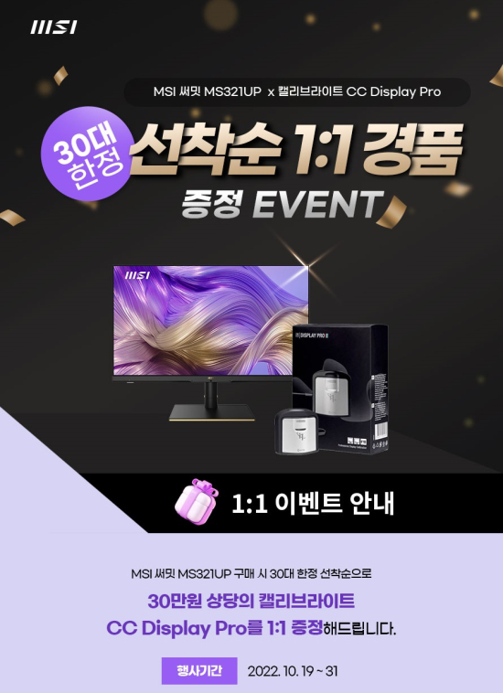 2022³â 10¿ù 19ÀϺÎÅÍ 31ÀϱîÁö ¿¸®´Â À̹ø Çà»ç´Â MSIÀÇ Ç÷¡±×½Ê ¸ð´ÏÅÍ, ¡®MSI ½á¹Ô MS321UP¡¯¸¦ ±¸¸ÅÇÏ´Â ¼±Âø¼ø 30¸í¿¡°Ô 35¸¸ ¿ø »ó´çÀÇ Ä¶¸®ºê·¹ÀÌ¼Ç Åø, ¡®Ä¶¸®ºê¶óÀÌÆ® CC Display Pro¡¯¸¦ ÁõÁ¤ÇÑ´Ù.