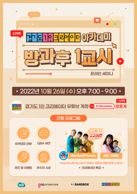 ¼¼¹Ì³ª ¡®¹æ°ú ÈÄ 1±³½Ã¡¯¿¡¼´Â ¿ÃÇØ 300¸íÀÌ Âü¿©ÇÑ °æ±âµµ 1ÀÎ Å©¸®¿¡ÀÌÅÍ ¾ÆÄ«µ¥¹Ì ±³À° Èıâ¿Í À¯¸í Å©¸®¿¡ÀÌÅÍ Æ¯°ÀÌ ÁغñµÇ¾î ÀÖ´Ù. ¼¼¹Ì³ª´Â °æ±âµµ 1ÀÎ Å©¸®¿¡ÀÌÅÍ °ø½Ä À¯Æ©ºê ä³Î(youtube.com/c/°æ±âµµ1ÀÎÅ©¸®¿¡ÀÌÅÍ)À» ÅëÇØ »ýÁß°è µÇ¸ç ´©±¸³ª ½ÃûÇÒ ¼ö ÀÖ´Ù.