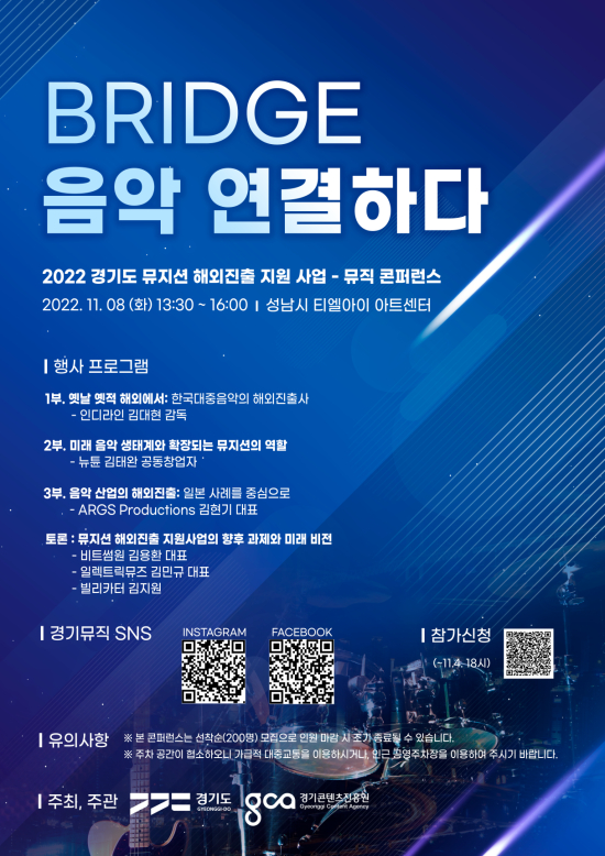 ¡®2022 °æ±âµµ ¹ÂÁö¼Ç ÇØ¿ÜÁøÃâ Áö¿ø»ç¾÷¡¯À¸·Î ÁøÇàÇÏ´Â ¹ÂÁ÷ ÄÜÆÛ·±½º´Â ¡®BRIDGE_À½¾Ç_¿¬°áÇÏ´Ù¡¯¶ó´Â ÁÖÁ¦·Î À½¾ÇÀÇ ÇöÀç¿Í ¹Ì·¡, À½¾Ç°ú IT ±â¼úÀÇ À¶ÇÕ, ÇØ¿Ü ÁøÃâ°ú ±³·ù µîÀ» ÁÖÁ¦·Î ¾÷°è Àü¹®°¡°¡ ¹ßÁ¦ÇÒ ¿¹Á¤ÀÌ´Ù.