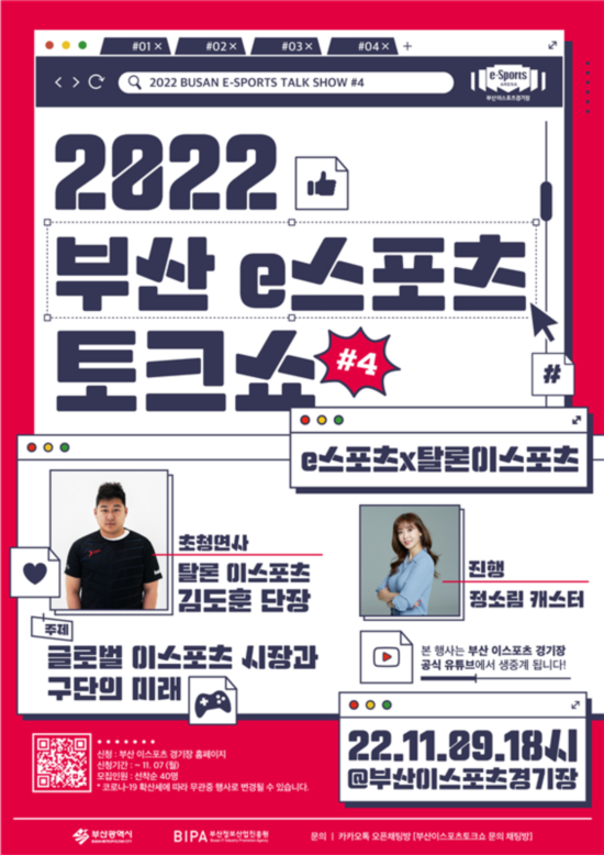 ºÎ»ê½Ã¿Í ºÎ»êÁ¤º¸»ê¾÷ÁøÈï¿ø(ÀÌÇÏ ¡®ÁøÈï¿ø¡¯)ÀÌ 2022 Á¦4ȸ ºÎ»ê e½ºÆ÷Ã÷ ÅäÅ©¼î¸¦ ¿À´Â 11¿ù 9ÀÏ(¼ö) ¿ÀÈÄ 6½Ã¿¡ ºÎ»êÀ̽ºÆ÷Ã÷°æ±âÀå(ÀÌÇÏ ¡®ºê·¹³ª¡¯)¿¡¼ °³ÃÖÇÑ´Ù.
