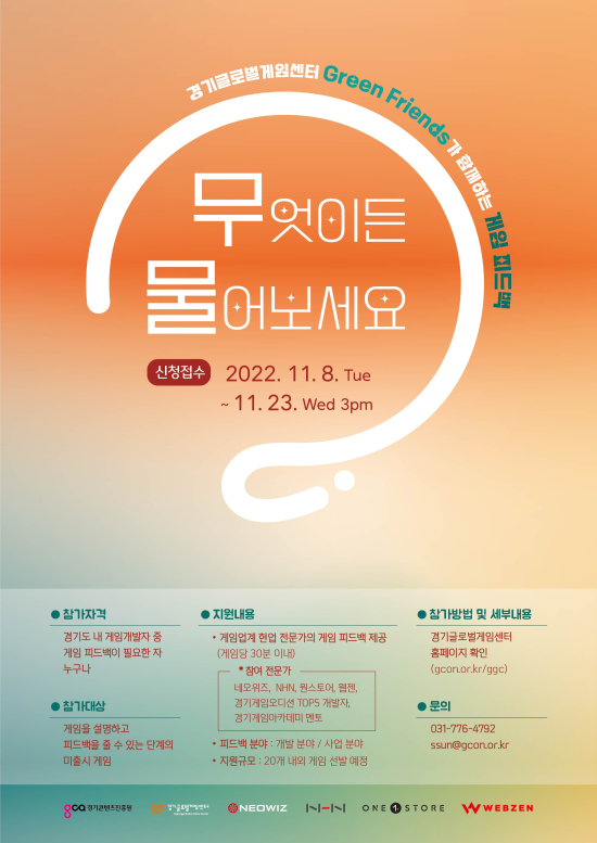 À̹ø ÄÁ¼³ÆÃÀº °ÔÀÓÀ» °³¹ßÇÏ´Â Áß¿¡ Á÷¸éÇÏ´Â ´Ù¾çÇÑ ±Ã±ÝÁõ¿¡ ´ëÇØ Çö¾÷ Àü¹®°¡µéÀÇ »ý»ýÇÑ Çǵå¹éÀ» Á¦°øÇϰíÀÚ °æÄÜÁø °æ±â±Û·Î¹ú°ÔÀÓ¼¾ÅÍ¿Í ¿ø½ºÅä¾î¸¦ ºñ·ÔÇÑ ¡®±×¸° ÇÁ·»Áî(GGC Green Friends, ÀÌÇÏ ±×¸° ÇÁ·»Áî)¡¯°¡ ÇÔ²² ¸¶·ÃÇß´Ù.