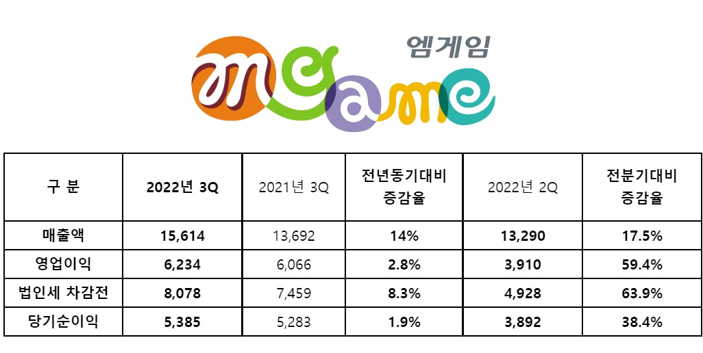 ¿¥°ÔÀÓÀº 2022³â 3ºÐ±â ¿¬°á ±âÁØ ¸ÅÃâ 156¾ï¿ø, ¿µ¾÷ÀÌÀÍ 62¾ï¿ø, ´ç±â¼øÀÌÀÍ 54¾ï¿øÀ» ´Þ¼ºÇß´Ù°í 14ÀÏ ¹àÇû´Ù.