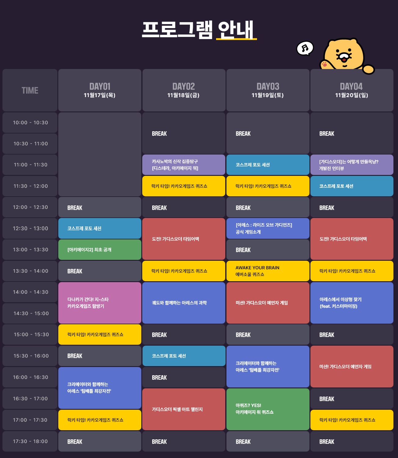 īī¿À°ÔÀÓÁî ºÎ½º Áß¾Ó¿¡´Â ¸ÞÀÎ ½ºÅ×ÀÌÁö°¡ ¼³Ä¡µÅ ´Ù¾çÇÑ Çà»ç ÇÁ·Î±×·¥À» ÁøÇàÇÑ´Ù. °³¹ßÁø ÀÎÅͺ並 ºñ·ÔÇØ ÄûÁî¼î, °ÔÀÓ ¼Ò°³ µîÀ» ÁøÇàÇϸç, ÁÖ±âÀûÀ¸·Î 'īī¿À°ÔÀÓÁî ÄûÁî¼î'¸¦ ÁøÇàÇØ °æÇ°À» ÁõÁ¤ÇÑ´Ù.