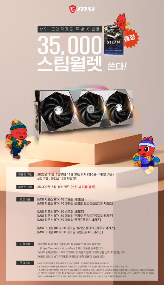 À̹ø Çà»ç´Â 2022³â 11¿ù 1ÀϺÎÅÍ 11¿ù 31ÀϱîÁö MSI ±×·¡ÇÈÄ«µå¸¦ ±¸¸ÅÇϰí Á¦Ç°µî·ÏÀ» ¸¶Ä£ °í°´À» ´ë»óÀ¸·Î ÁøÇàµÇ¸çÀ̺¥Æ® ´ë»ó Á¦Ç°Àº MSI ÁöÆ÷½º RTX 4090 ½´ÇÁ¸²X Æ®¶óÀÌÇÁ·ÎÁ®3S, MSI ÁöÆ÷½º RTX 4090 °ÔÀ̹ÖX Æ®¶óÀÌÇÁ·ÎÁ®3, MSI ÁöÆ÷½º RTX 4080 ½´ÇÁ¸²X Æ®¶óÀÌÇÁ·ÎÁ®3S, MSI ÁöÆ÷½º RTX 4080 °ÔÀ̹ÖX Æ®¶óÀÌÇÁ·ÎÁ®3, MSI ÁöÆ÷½º RTX 30 ½´ÇÁ¸² ½Ã¸®Áî, MSI ÁöÆ÷½º RTX 30 °ÔÀÌ¹Ö Æ®¶óÀÌÇÁ·ÎÁ®2 ½Ã¸®Áî, MSI ÁöÆ÷½º RTX 30 °ÔÀÌ¹Ö Æ®À©ÇÁ·ÎÁ®8 ½Ã¸®Áî, MSI ¶óµ¥¿Â RX 6000 °ÔÀÌ¹Ö Æ®¶óÀÌÇÁ·ÎÁ®2 ½Ã¸®Áî, MSI ¶óµ¥¿Â RX 6000 °ÔÀÌ¹Ö Æ®À©ÇÁ·ÎÁ®8 ½Ã¸®Áî´Ù.