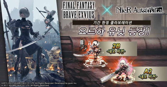 gumi Inc.´Â SQUARE ENIX Ltd.,¿Í °øµ¿ °³¹ßÇϰí Àڻ簡 ¼ºñ½ºÇÏ´Â ¸ð¹ÙÀÏ RPG ¡®FINAL FANTASY BRAVE EXVIUS(ÆÄÀ̳ΠÆÇŸÁö ºê·¹ÀÌºê ¿¢½ººñ¾î½º, ÀÌÇÏ FFBE)¡¯¿¡¼ NieR:Automata(´Ï¾î:¿ÀÅ丶Ÿ)¿ÍÀÇ Äݶ󺸷¹ÀÌ¼Ç ÄÜÅÙÃ÷¸¦ ¼±ºÈ´Ù°í 22ÀÏ ¹àÇû´Ù.