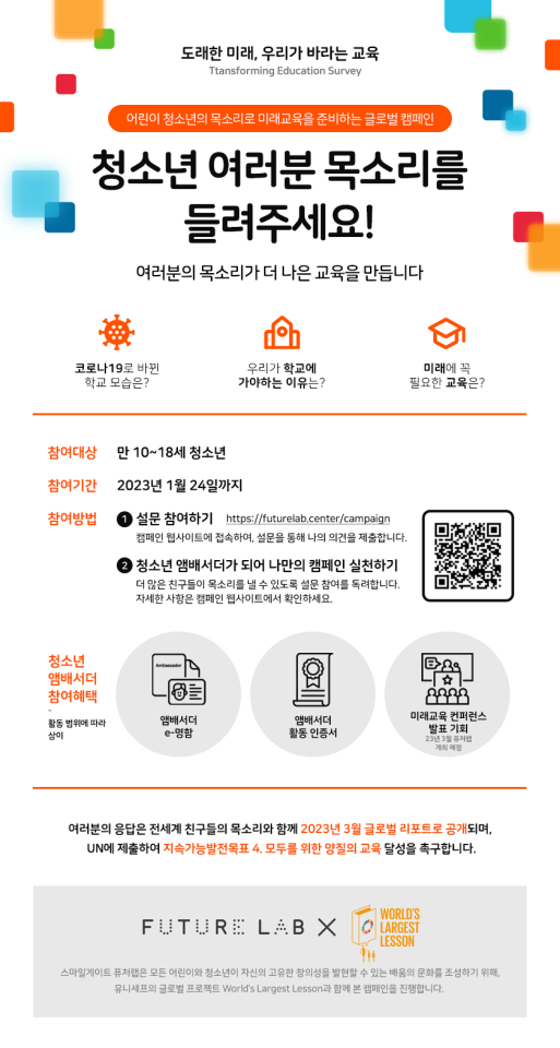 ½º¸¶ÀϰÔÀÌÆ® ǻó·¦(ÀÌÇÏ ¡®Ç»Ã³·¦¡¯)Àº À¯´Ï¼¼ÇÁ ±Û·Î¹ú Ä·ÆäÀÎ ¿ùµå ¶óÁö½ºÆ® ·¹½¼(World¡¯s Largest Lesson, ÀÌÇÏ ¡®WLL¡¯)°ú ÇÔ²² ±Û·Î¹ú Ä·ÆäÀÎ ¡®µµ·¡ÇÑ ¹Ì·¡, ¿ì¸®°¡ ¹Ù¶ó´Â ±³À°(Transforming Education Survey)¡¯À» ½Ç½ÃÇÑ´Ù°í 24ÀÏ (¸ñ) ¹àÇû´Ù. À̹ø Ä·ÆäÀÎÀº ¹Ì·¡±³À° ºñÀü ¼ö¸³À» À§ÇØ ±âȹµÆ´Ù.
