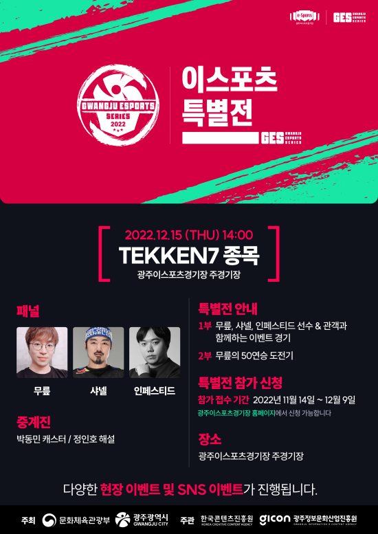 ±¤ÁÖÀ̽ºÆ÷Ã÷°æ±âÀåÀ» ¿î¿µÇÏ´Â ±¤ÁÖÁ¤º¸¹®È»ê¾÷ÁøÈï¿øÀº 2022³âÀÇ ¸¶Áö¸· ´ÞÀÎ 12¿ùÀ» ¸Â¾Æ ¡®GES¡¯ ÅëÇÕ ºê·£µå¸¦ Ȱ¿ëÇÑ °¢Á¾ ´ëȸ ¹× Çà»ç¸¦ ÁغñÇß´Ù°í ¹àÇû´Ù. ±¤ÁÖÁ¤º¸¹®È»ê¾÷ÁøÈï¿øÀº 12¿ù ÃÊ ¡®GES¡¯ PCŬ·´ ¸¶½ºÅÍÁî ½ÃÁð2 ´ëȸ¸¦ °³ÃÖÇϰí, 12¿ù Áß¼ø, ö±Ç°èÀÇ »ì¾ÆÀÖ´Â Àü¼³ DRX ¹«¸ ¼±¼ö¸¦ ÃÊûÇÏ¿© ¡®GES¡¯ À̽ºÆ÷Ã÷ Ưº°ÀüÀ» ÁøÇàÇÑ´Ù.