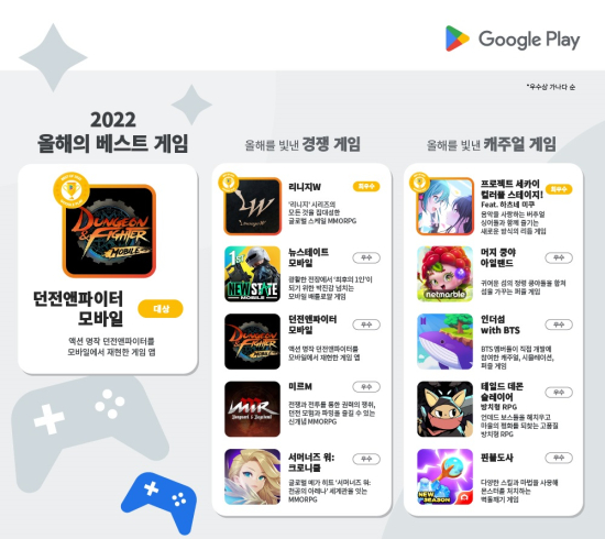 ¸Å³â ¿¬¸» ±¸±ÛÇ÷¹ÀÌ´Â ¿£ÅÍÅ×ÀÎ¸ÕÆ®, ÀÚ±â°è¹ß µî ´Ù¾çÇÑ ºÎ¹®¿¡¼ À¯ÀúµéÇÑÅ× »ç¶û¹ÞÀº ¿ÃÇØÀÇ ¾Û°ú ijÁÖ¾ó, Àεð µî ÇÑ ÇØ¸¦ ºû³½ ¿ÃÇØÀÇ °ÔÀÓÀ» ¹ßÇ¥ÇÑ´Ù. ¡®2022 ¿ÃÇØ¸¦ ºû³½ º£½ºÆ® ¾Û¡¯¿¡´Â ¡®Disney+¡¯, º£½ºÆ® °ÔÀÓ¿¡´Â ¡®´øÀü¾ØÆÄÀÌÅÍ ¸ð¹ÙÀÏ¡¯ÀÌ ¼±Á¤µÇ¾úÀ¸¸ç, ÀÌ¿ëÀÚ°¡ Á÷Á¢ ÅõÇ¥ÇØ¼ »ÌÀº ¡®2022 ¿ÃÇØ¸¦ ºû³½ Àα⠾ۡ¯¿¡´Â ¡®³×À̹ö ÆäÀÌ¡¯, Àα⠰ÔÀÓ¿¡´Â ¡®ºí·ç ¾ÆÄ«À̺ꡯ°¡ ¼±Á¤µÇ´Â ¿µ¿¹¸¦ ¾È¾Ò´Ù.