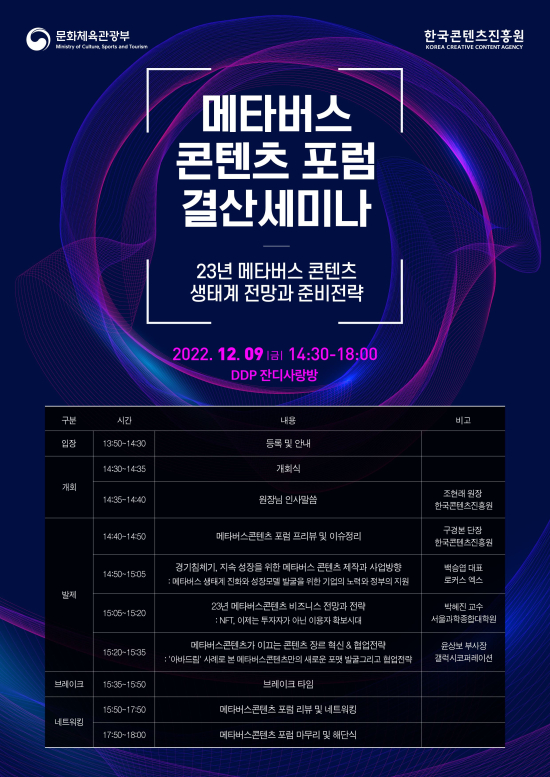 Áö³ 6¿ùºÎÅÍ Á¤±âÀûÀ¸·Î °³ÃÖÇØ ¿Â ¸ÞŸ¹ö½º ÄÜÅÙÃ÷ Æ÷·³Àº ¸ÞŸ¹ö½º ÄÜÅÙÃ÷ »ýŰè Ȱ¼ºÈ ¹× »õ·Î¿î ¼ºÀå ¸ðµ¨ ¹ß±¼À» À§ÇØ ÁøÇàµÆ´Ù. À̹ø 2022 °á»ê ¼¼¹Ì³ª¿¡¼´Â ¿ù º°·Î ÁøÇàµÈ ÁÖ¿ä ³íÀÇ °á°ú¸¦ ¹ÙÅÁÀ¸·Î ¸ÞŸ¹ö½º ÄÜÅÙÃ÷ ºñÁî´Ï½º ÃßÁø ¹æÇâ°ú °æ±â ħü ¼Ó ¸ÞŸ¹ö½º ÄÜÅÙÃ÷ ½ÃÀå ¼ºÀåÀ» ÃËÁøÇϱâ À§ÇÑ Á¤ºÎÀÇ ¿ªÇÒ°ú Áö¿ø Á¤Ã¥ ¹æÇâ¿¡ ´ëÇØ ³íÀÇÇÑ´Ù.