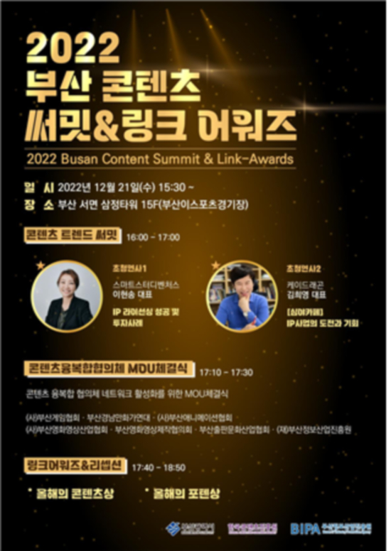 ¡¸2022 ºÎ»ê ÄÜÅÙÃ÷ ½á¹Ô&¸µÅ© ¾î¿öÁ´Â ºÎ»êÀÇ ¿ì¼ö ÄÜÅÙÃ÷¿Í ±â¾÷À» ¹ß±¼Çϰí Áö¿ª ³»ÀÇ IP±â¹Ý ÄÜÅÙÃ÷ Çù¾÷ Ȱ¼ºÈ¸¦ µµ¸ðÇϱâ À§ÇØ ±âȹµÈ Çà»ç·Î, ºÎ»êÀ̽ºÆ÷Ã÷°æ±âÀå¿¡¼ ¡ãÄÜÅÙÃ÷ ½á¹Ô ¡ãÄÜÅÙÃ÷ À¶º¹ÇÕ ÇùÀÇü MOU ü°á½Ä ¡ãºÎ»ê ÄÜÅÙÃ÷ ¸µÅ© ¾î¿öÁî ¼øÀ¸·Î ÁøÇàµÉ ¿¹Á¤ÀÌ´Ù.
