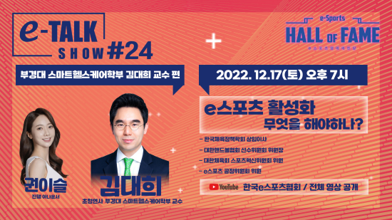 Çѱ¹e½ºÆ÷Ã÷Çùȸ°¡ e½ºÆ÷Ã÷ ¸í¿¹ÀÇ Àü´ç(¼¿ï ¸¶Æ÷)¿¡ ºÎ°æ´ëÇб³ ½º¸¶Æ®ÇコÄɾîÇкΠ±è´ëÈñ ±³¼ö¸¦ ÃÊÃ»ÇØ ¡®e½ºÆ÷Ã÷ Ȱ¼ºÈ, ¹«¾ùÀ» ÇØ¾ßÇϳª¡¯ ¶ó´Â ÁÖÁ¦·Î ¿ÃÇØ ¸¶Áö¸· ¡®e-ÅäÅ©¼î¡¯¸¦ 17ÀÏ(Åä) ¿ÀÈÄ 7½Ã¿¡ ¹æ¼ÛÇÑ´Ù°í ¹àÇû´Ù.