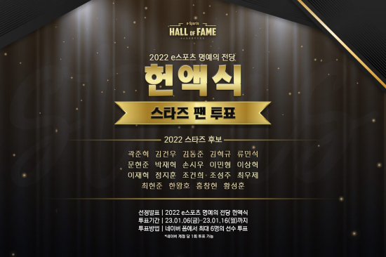Çѱ¹e½ºÆ÷Ã÷Çùȸ°¡ ¡®2022 e½ºÆ÷Ã÷ ¸í¿¹ÀÇ Àü´ç Çå¾×½Ä¡¯ °³ÃÖ¿¡ ¾Õ¼ 2022³âÀ» ºû³½ e½ºÆ÷Ã÷ ¼±¼ö¸¦ ÆÒµéÀÌ Á÷Á¢ ¼±¹ßÇÏ´Â ¡®½ºÅ¸ÁÀÇ ¿Â¶óÀÎ ÅõÇ¥¸¦ 6ÀÏ(±Ý)ºÎÅÍ ½ÃÀÛÇÑ´Ù.