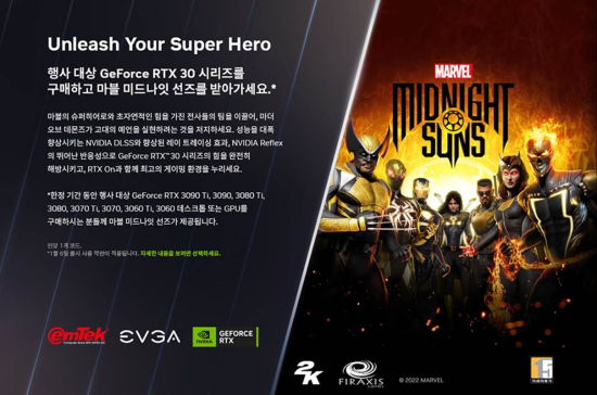 ÀÌ¿¥ÅؾÆÀÌ¿£¾¾(ÀÌÇÏ ÀÌ¿¥ÅØ)´Â ÀÌ¿¥ÅØ EVGA ÁöÆ÷½º RTX 3060 ½Ã¸®Áî ÀÌ»ó ±×·¡ÇÈÄ«µå Á¦Ç° ¶Ç´Â ÇØ´ç ±×·¡ÇÈÄ«µå°¡ ÀåÂøµÈ ¿ÏÁ¦ PC ±¸¸Å °í°´À» ´ë»óÀ¸·Î ¡®Marvel's Midnight Suns' (ÀÌÇÏ ¸¶ºí ¹Ìµå³ªÀÕ ¼±Áî) ¹øµé ÇÁ·Î¸ð¼Ç À̺¥Æ®¸¦ 2022³â 12¿ù 13ÀϺÎÅÍ 2023³â 1¿ù 31ÀϱîÁö ¿¬Àå ÁøÇàÇÑ´Ù°í ¹àÇû´Ù.