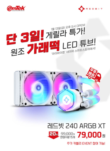 ÀÌ¿¥ÅؾÆÀÌ¿£¾¾´Â Æ©ºêµµ ARGB LED¸¦ Áö¿øÇÏ´Â ÀÏüÇü ¼ö³Ã Äð·¯ ·¹µåºø 240 ARGB XT ÈÀÌÆ®¸¦ 2023³â 1¿ù 13ÀÏ(±Ý) 17½ÃºÎÅÍ 15ÀÏ(ÀÏ)±îÁö 20% ÇÒÀÎ µÈ 79,000¿ø¿¡ ÇÑÁ¤¼ö·® 15°³¸¦ ¹«·á¹è¼ÛÀ¸·Î ÆÇ¸ÅÇÑ´Ù ¹àÇû´Ù.