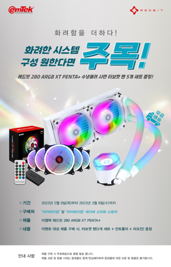 ÀÌ¿¥ÅؾÆÀÌ¿£¾¾´Â 2023³â 2¿ù 9ÀÏ(¸ñ)ºÎÅÍ 3¿ù 8ÀÏ(¼ö)±îÁö ·¹µåºø 280 ARGB XT PENTA+ ±¸¸Å ½Ã ÀÌ¿¥ÅØ ·¹µåºø Åͺ¸Á¬ 140E R2 140mm½Ã½ºÅÛ ÆÒ 5°³ ¼¼Æ®, ÄÁÆ®·Ñ·¯, ¸®¸ðÄÁÀ» ¹«·á¹è¼ÛÀ¸·Î ÁõÁ¤ÇÏ´Â À̺¥Æ®¸¦ ÁøÇàÇÑ´Ù ¹àÇû´Ù.