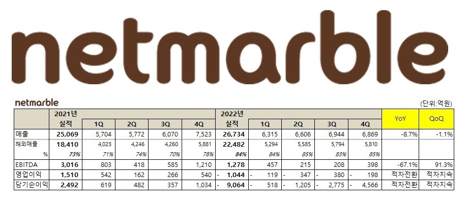 ³Ý¸¶ºíÀº ÀÛ³â 4ºÐ±â ¿¬°á±âÁØÀ¸·Î ¸ÅÃâ 6,869¾ï¿ø(YoY -8.7%, QoQ -1.1%), EBITDA(»ó°¢Àü ¿µ¾÷ÀÌÀÍ) 398¾ï¿ø(YoY -67.1%, QoQ +91.3%), ¿µ¾÷¼Õ½Ç 198¾ï¿ø(YoY ÀûÀÚÀüȯ, QoQ ÀûÀÚÁö¼Ó)À» ±â·ÏÇß´Ù°í 9ÀÏ ¹àÇû´Ù.