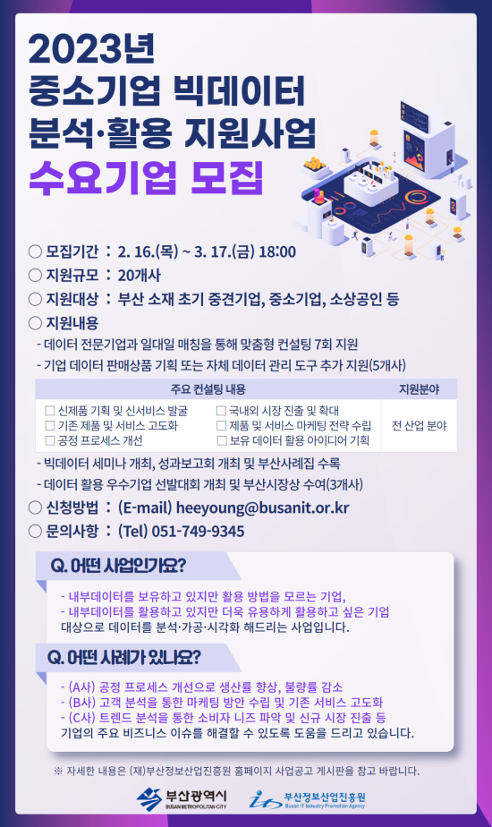 ºÎ»ê½Ã¿Í ºÎ»êÁ¤º¸»ê¾÷ÁøÈï¿øÀº Áö¿ª ºòµ¥ÀÌÅÍ »ê¾÷ Ȱ¼ºÈ ¹× ±â¾÷ÀÇ µ¥ÀÌÅÍ È°¿ë ÀÚ»ý·Â °È¸¦ À§ÇÑ ¡¸2023³â Áß¼Ò±â¾÷ ºòµ¥ÀÌÅÍ ºÐ¼®¡¤È°¿ë Áö¿ø»ç¾÷¡¹¿¡ Âü¿©ÇÒ ±â¾÷ 20°³»ç¸¦ 3¿ù 17ÀϱîÁö ¸ðÁýÇÑ´Ù°í ¹àÇû´Ù.