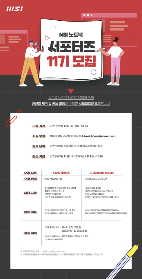 ¸ðÁý ºÎ¹®Àº MSI ³ëÆ®ºÏ ÄÜÅÙÃ÷ Á¦ÀÛ ¹× °Ô½Ã, ¿Â¶óÀÎ È«º¸ Ȱµ¿À» ÇÏ´Â 'SNS ¼Æ÷ÅÍÁî'¿Í MSI ³ëÆ®ºÏ »çÁø¡¤¿µ»ó ÃÔ¿µ ¹× È«º¸, ³ëÆ®ºÏ »ç¿ë Èı⸦ Á¦ÀÛÇÏ´Â 'Å©¸®¿¡ÀÌÅÍ ¼Æ÷ÅÍÁî'·Î ¼±ÅÃÇÏ¿© Áö¿ø °¡´ÉÇÏ´Ù.