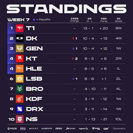 Áö³ 6ÁÖ Â÷¿¡¼ T1ÀÌ ¿¬½ÂÀ» À̾¸é¼ °¡Àå ¸ÕÀú 6° Ç÷¹ÀÌ¿ÀÇÁÇà Æ¼ÄÏÀ» ¼Õ¿¡ ³Ö¾ú°í 7ÁÖ Â÷¿¡¼´Â µðÇ÷¯½º ±â¾Æ°¡ DRX¿Í ÇÑÈ»ý¸íe½ºÆ÷Ã÷¸¦ »ó´ë·Î 2¿¬½ÂÀ» º¸ÅÂ¸é¼ 4ÀÏ(Åä) Ç÷¹ÀÌ¿ÀÇÁ ÁøÃâÀ» È®Á¤ Áö¾ú´Ù. 5ÀÏ(ÀÏ) ¿¸° µÎ °æ±â¿¡¼ KT ·Ñ½ºÅÍ¿Í Á¨Áö°¡ ¸®ºê »÷µå¹Ú½º¿Í ºê¸®¿ÂÀ» °¢°¢ °ÝÆÄÇÏ¸é¼ 3À§ÀÎ Á¨Áö¿Í °øµ¿ 4À§ÀÎ KT ·Ñ½ºÅÍ, ÇÑÈ»ý¸íe½ºÆ÷Ã÷±îÁö Ç÷¹ÀÌ¿ÀÇÁ ƼÄÏÀ» °Å¸ÓÁã¾ú´Ù.