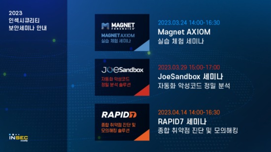 µðÁöÅÐ Æ÷·»½Ä ¹æ¹ýÀ» ¼Ò°³ÇÏ´Â ¡®¸¶±×³Ý ¿¢½Ã¿ò ¼¼¹Ì³ª(3¿ù 24ÀÏ(±Ý) ¿ÀÈÄ2½Ã)¡¯ °³ÃÖÇϸç, ¾Ç¼ºÄÚµå ŽÁö ¹× ºÐ¼® ¹æ¹ýÀ» ¼Ò°³ÇÏ´Â ¡®Á¶½ÃÅ¥¸®Æ¼ Á¶»÷µå¹Ú½º(Joe Sandbox) ¼¼¹Ì³ª(3¿ù 29ÀÏ(¼ö) ¿ÀÈÄ 3½Ã)¡¯ °³ÃÖ, º¸¾È Ãë¾àÁ¡ Áø´Ü ¹× °ü¸® ¹æ¹ýÀ» ¼Ò°³ÇÏ´Â ¡®·¡Çǵå7(RAPID7) ¼¼¹Ì³ª(4¿ù 14ÀÏ(±Ý) ¿ÀÈÄ 2½Ã)¡¯ °³ÃÖÇÑ´Ù.