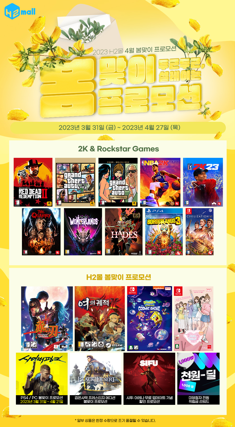 ¶ÇÇÑ ¡®·¹µå µ¥µå ¸®µ©¼Ç 2¡¯, ¡®GTA V¡¯, ¡®GTA: Æ®¸±·ÎÁö – µ¥ÇÇ´ÏÆ¼ºê ¿¡µð¼Ç¡¯, ¡®NBA 2K23¡¯, ¡®PGA TOUR 2K23¡¯, ¡®Äõ¸®¡¯, ¡®Å¸ÀÌ´Ï Æ¼³ªÀÇ ¿ø´õ·£µå¡¯, ¡®Çϵ¥½º¡¯, ¡®º¸´õ·£µå 3¡¯, ¡®¹®¸í VI¡¯, ¡®°ËÀº»ç¸· ÇÁ·¹½ºÆ¼Áö ¿¡µð¼Ç¡¯, ¡®½ÃǪ: º¥Á¨½º ¿¡µð¼Ç¡¯ µîÀÇ Å¸ÀÌÆ²¿¡ ´ëÇØ¼´Â H2¸ôÀ» ºñ·ÔÇÑ ±¹³» ¼îÇθô ¹× °ÔÀÓ¼¥¿¡¼ 4¿ù 27ÀϱîÁö Ưº° ÇÒÀÎ À̺¥Æ®°¡ ÁøÇàµÇ¸ç, º°µµ·Î 4¿ù 21ÀϱîÁö ¡®»çÀ̹öÆãÅ© 2077¡¯ ÇÒÀÎ ÇÁ·Î¸ð¼Çµµ ÇÔ²² ÁغñµÉ ¿¹Á¤ÀÌ´Ù.