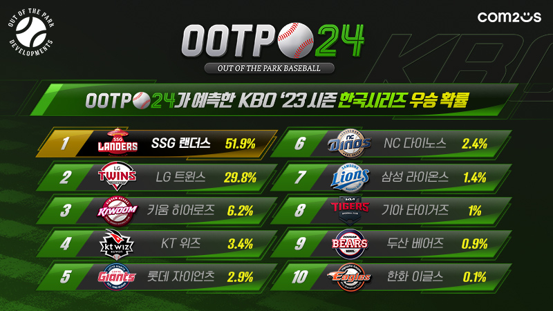 ÄÄÅõ½ºÀÇ ÀÚȸ»ç ¡®¾Æ¿ô ¿Àºê ´õ ÆÄÅ© µðº§·Ó¸ÕÃ÷(Out of the Park Developments)¡¯°¡ °³¹ßÇÏ°í ¼ºñ½ºÇÏ´Â MLB, KBO ¶óÀ̼±½º ¾ß±¸ °ÔÀÓ ¡®¾Æ¿ô ¿Àºê ´õ ÆÄÅ© º£À̽ºº¼ 24(ÀÌÇÏ OOTP 24)¡¯°¡ ¡®2023 KBO¡¯¿Í ¡®2023 MLB¡¯¸¦ Àü¸ÁÇÏ´Â ½Ã¹Ä·¹À̼ÇÀ» ÁøÇàÇÏ°í °á°ú¸¦ °ø°³Çß´Ù.