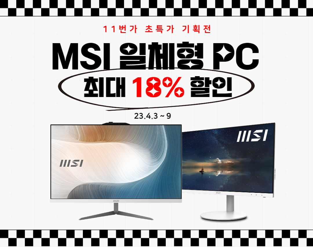 2023³â 4¿ù 3ÀϺÎÅÍ 9ÀϱîÁö, ´Ü ÀÏÁÖÀϰ£ ÁøÇàµÇ´Â À̹ø ±âȹÀüÀº ¸ð´ÏÅÍ¿Í µ¥½ºÅ©Å¾ÀÌ Çϳª·Î °áÇÕµÇ¾î °ø°£ÀÇ È¿À²À» ±Ø´ëÈ­½Ãų ¼ö ÀÖ´Â MSI ÀÏüÇüPC(All-In-One) ´ë»óÀ¸·Î 13% Áï½Ã Àû¿ë ÄíÆù°ú 5% Ä«µåÇÒÀÎÀ» ´õÇØ ÃÖ´ë 18% Ư°¡ÇýÅÃÀ» Á¦°øÇÑ´Ù.