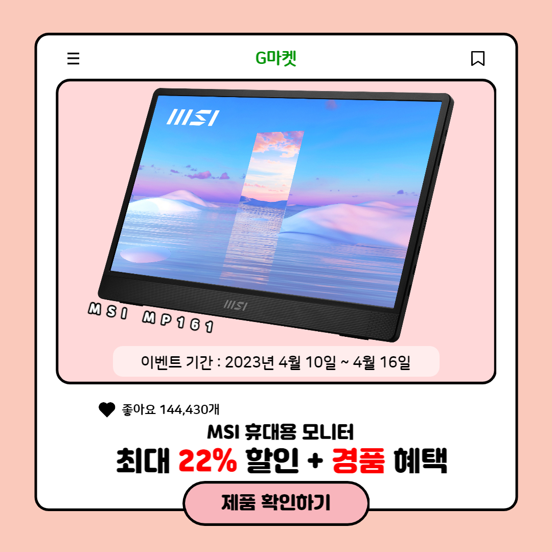 2023³â 4¿ù 10ÀϺÎÅÍ 7Àϰ£ ÁøÇàµÇ´Â À̹ø ÇÒÀÎÀüÀº °¡°Ý´ëºñ ¿ì¼öÇÑ ¼º´ÉÀ¸·Î ¸¹Àº »ç¶ûÀ» ¹Þ°í ÀÖ´Â 15.6ÀÎÄ¡ ÈÞ´ë¿ë ¸ð´ÏÅÍ ¡®MSI MP161¡¯ ´ë»óÀ¸·Î 12% Áߺ¹ÄíÆù°ú 5% Áï½ÃÇÒÀÎ ÄíÆù, 5% Ä«µåÇÒÀÎÀ» ´õÇØ ÃÖ´ë 22% ÃÊÆ¯°¡ ÇýÅÃÀ» Á¦°øÇÑ´Ù.
