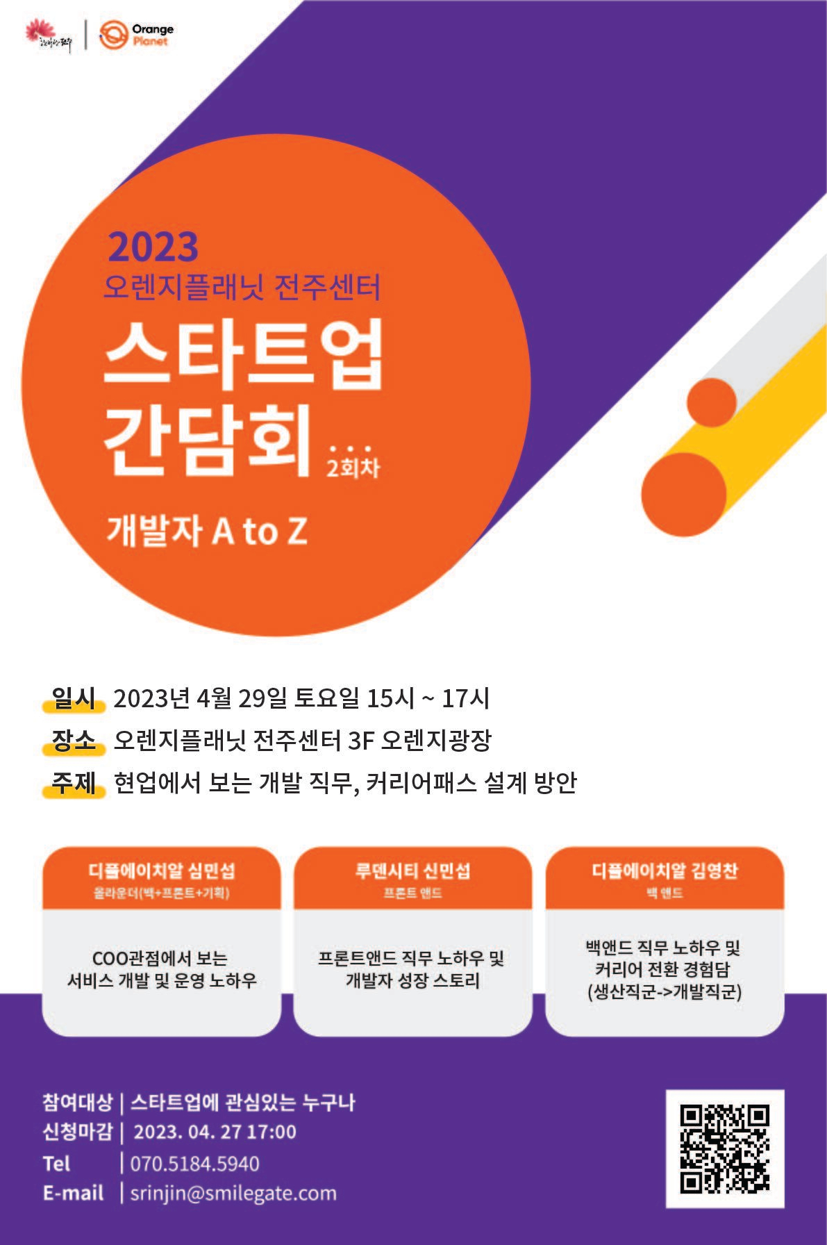 ¿À·»ÁöÇ÷¡´Ö ÀüÁÖ¼¾ÅÍ´Â ÀüºÏ Áö¿ª °³¹ßÀÚ, ¿¹ºñ °³¹ßÀÚµéÀÇ ¼ºÀå°ú Ä¿¸®¾îÆÐ½º ¼³°è¸¦ µ½´Â µ¿½Ã¿¡, °³¹ßÀÚ Ã¤¿ë¿¡ ¾î·Á¿òÀ» °Þ°í ÀÖ´Â ½ºÅ¸Æ®¾÷ÀÇ °í¹ÎÀ» ÇÔ²² ÇØ¼ÒÇØ º¸°íÀÚ °£´ãȸ ÁÖÁ¦¸¦ °³¹ß Á÷¹«·Î ¼±Á¤Çß´Ù.