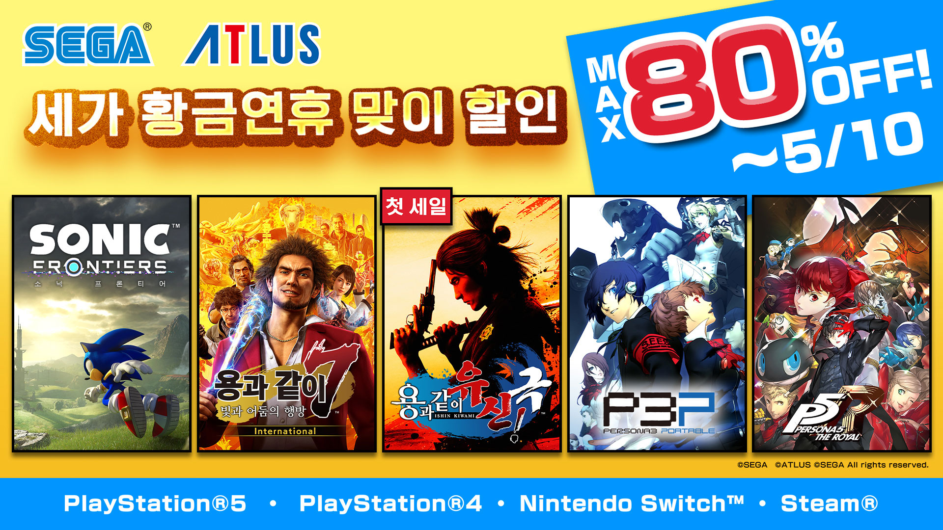 ¼¼°¡ÆÛºí¸®½ÌÄÚ¸®¾Æ´Â PlayStation¢âStore ¹× ´ÑÅÙµµ e¼ó, Steam¿¡¼ ÆÇ¸Å ÁßÀÎ ÀϺΠPlayStation¢ç5/PlayStation¢ç4/Nintendo Switch¢â/PC(Steam)¿ë ŸÀÌÆ²À» ±â°£ ÇÑÁ¤À¸·Î Ưº° °¡°Ý¿¡ ÆÇ¸ÅÇÏ´Â ¡¸SEGA Ȳ±Ý¿¬ÈÞ ¸ÂÀÌ ÇÒÀΡ¹À» 2023³â 5¿ù 10ÀÏ(¼ö)±îÁö °³ÃÖ ÁßÀÌ´Ù. ¡ØSteamÀº 4¿ù 27ÀÏ(¸ñ) 2:00ºÎÅÍ ½ÃÀÛ ¿¹Á¤.