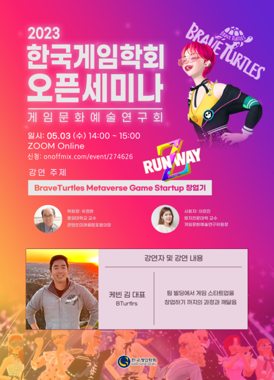 Çѱ¹°ÔÀÓÇÐȸ °ÔÀÓ¹®È¿¹¼ú¿¬±¸È¸°¡ 'ºê·¹À̺êÅÍÆ²½º ¸ÞŸ¹ö½º °ÔÀÓ ½ºÅ¸Æ®¾÷(BraveTurtles Metaverse Game Startup) â¾÷±â'¸¦ ÁÖÁ¦·Î ÇÑ ¿ÀǼ¼¹Ì³ª¸¦ ¿À´Â 3ÀÏ ¿ÀÈÄ 2½Ã ¿Â¶óÀÎÀ¸·Î °³ÃÖÇÑ´Ù.