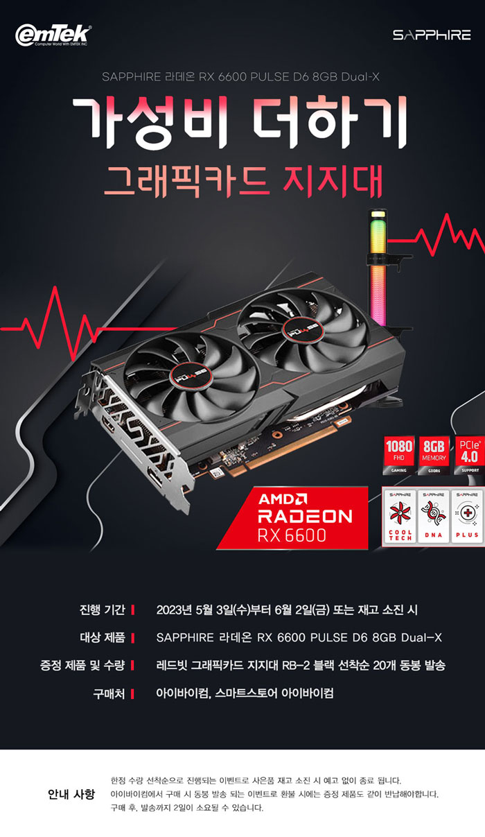 ÀÌ¿¥ÅؾÆÀÌ¿£¾¾Àº 2023³â 5¿ù 3ÀÏ(¼ö)ºÎÅÍ 6¿ù 2ÀÏ(±Ý)±îÁö SAPPHIRE ¶óµ¥¿Â RX 6600 PULSE D6 8GB Dual-X¸¦ ¢ßÀÌ¿¥ÅؾÆÀÌ¿£¾¾ °ø½Ä ¼îÇθô ¾ÆÀ̹ÙÀÌÄİú ½º¸¶Æ®½ºÅä¾î ¾ÆÀ̹ÙÀÌÄÄ¿¡¼ ±¸¸Å ½Ã, ·¹µåºø ±×·¡ÇÈÄ«µå ÁöÁö´ë RB-2 ºí·¢À» 20°³ ¼±Âø¼ø ÇÑÁ¤¼ö·®À¸·Î ÁõÁ¤ÇÑ´Ù ¹àÇû´Ù.