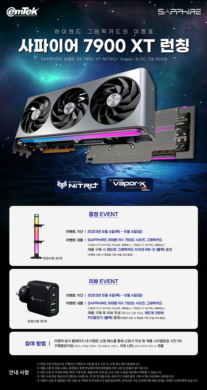 ÀÌ¿¥ÅؾÆÀÌ¿£¾¾´Â 2023³â 5¿ù 4ÀÏ(¸ñ)ºÎÅÍ 6¿ù 4ÀÏ(ÀÏ)±îÁö SAPPHIRE ¶óµ¥¿Â RX 7900 XT NITRO+ Vapor-X OC D6 20GB¸¦ Ãâ½ÃÇϸç, À̸¦ ±â³äÇÏ¿© ·±Äª À̺¥Æ®¸¦ ÁøÇàÇÑ´Ù°í ¹àÇû´Ù.