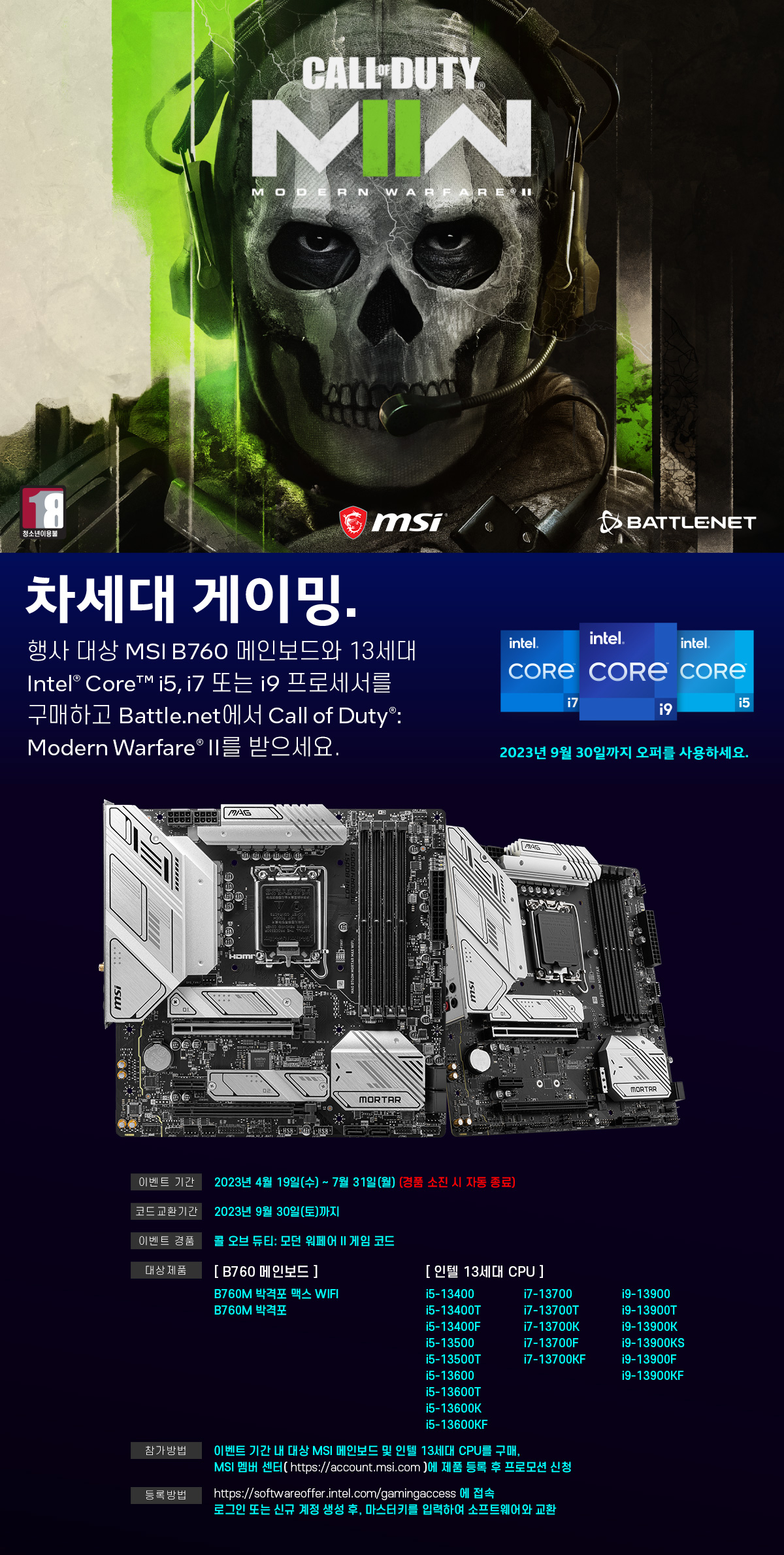 º» À̺¥Æ®´Â 4¿ù 19ÀÏ(¼ö)ºÎÅÍ 7¿ù 31ÀÏ(¿ù) »çÀÌ¿¡ À̺¥Æ® ´ë»ó ¸ÞÀκ¸µå¿Í ÀÎÅÚ 13¼¼´ë ÄÚ¾î ÇÁ·Î¼¼¼¸¦ ±¸¸ÅÇÑ °í°´À» ´ë»óÀ¸·Î ÁøÇàµÈ´Ù. À̺¥Æ® Âü¿© °í°´Àº °æÇ°À¸·Î ¼¼°èÀûÀÎ FPS °ÔÀÓ ¡®ÄÝ ¿Àºê µàƼ: ¸ð´ø ¿öÆä¾î2¡¯ Äڵ带 ¹ÞÀ» ¼ö ÀÖÀ¸¸ç, °æÇ° ¼ÒÁø ½Ã À̺¥Æ®°¡ ÀÚµ¿ Á¾·áµÈ´Ù. À̺¥Æ®¿¡ °üÇÑ »ó¼¼ÇÑ Á¤º¸´Â ³×À̹ö MSI »ç¿ëÀÚ Ä«Æä¿¡¼ È®ÀÎÇÒ ¼ö ÀÖ´Ù.