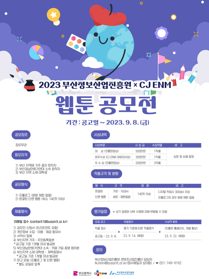 ¡¸ºÎ»êÁ¤º¸»ê¾÷ÁøÈï¿ø ¡¿ CJ ENM À¥Å÷ °ø¸ðÀü¡¹Àº ºÎ»ê½Ã, ºÎ»êÁ¤º¸»ê¾÷ÁøÈï¿ø, ±×¸®°í CJ ENMÀÌ °øµ¿ ÁÖÃÖÇÏ¿©, ºÎ»ê Áö¿ªÀÇ ÀáÀç·Â ÀÖ´Â À¥Å÷ âÀÛÀÚ¸¦ ¹ß°ßÇϰí ÃÖ±Ù ´Ã¾î³ª°í ÀÖ´Â ºÎ»ê Áö¿ª À¥Å÷ °ü·Ã Çаú ÀçÇлý ´ë»ó âÀÛ¿¡ ´ëÇÑ µ¿±âºÎ¿© Á¦°øÀ» ¸ñÀûÀ¸·Î ÇÑ´Ù.