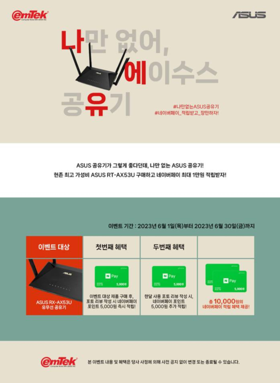 ÀÌ¿¥ÅؾÆÀÌ¿£¾¾(ÀÌÇÏ ÀÌ¿¥ÅØ)´Â 2023³â 6¿ù 1ÀÏ(¸ñ)ºÎÅÍ 6¿ù 30ÀÏ(±Ý)±îÁö, ÇöÁ¸ ÃÖ°í Wi-Fi 6 °¡¼ººñ °øÀ¯±â·Î °í°´´ÔµéÀÇ ¼ö¸¹Àº Âù»ç¸¦ ¹Þ°í ÀÖ´Â ½ÅÁ¦Ç° ASUS RT-AX53U À¯¹«¼± °øÀ¯±â ±¸¸Å °í°´ ´ë»óÀ¸·Î ³×À̹öÆäÀÌ ÃÑ 1¸¸¿ø Àû¸³ À̺¥Æ®¸¦ ÁøÇàÇÑ´Ù°í ¹àÇû´Ù.