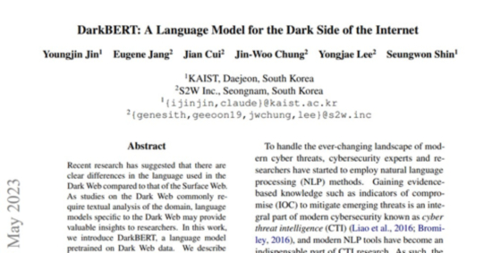 ´ÙÅ©À¥»ó¿¡¼ °¢Á¾ ¹üÁË µ¥ÀÌÅ͸¦ È¿°úÀûÀ¸·Î ÃßÃâÇÒ ¼ö ÀÖµµ·Ï ÈÆ·ÃÇÑ ´ÙÅ©À¥ Àü¹® ¾ð¾î ¸ðµ¨ ´ÙÅ©¹öÆ® (DarkBERT)´Â Áö³ 5¿ù 4ÀÏ ¼¼°èÀûÀÎ ÀÚ¿¬¾îó¸® Çмú´ëȸ ACL (Association for Computational Linguistics)¿¡ ¿¬±¸ ¼º°ú°¡ äÅÃµÇ°í ³í¹®ÀÌ °ø°³µÈ ÀÌÈÄ ±× ÃâÇö ¼Ò½ÄÀÌ Æ®À§ÅÍ¿Í IT ¹Ìµð¾î¸¦ ÅëÇØ¼ Àü ¼¼°è·Î ºü¸£°Ô È®»êµÇ°í ÀÖ´Ù.