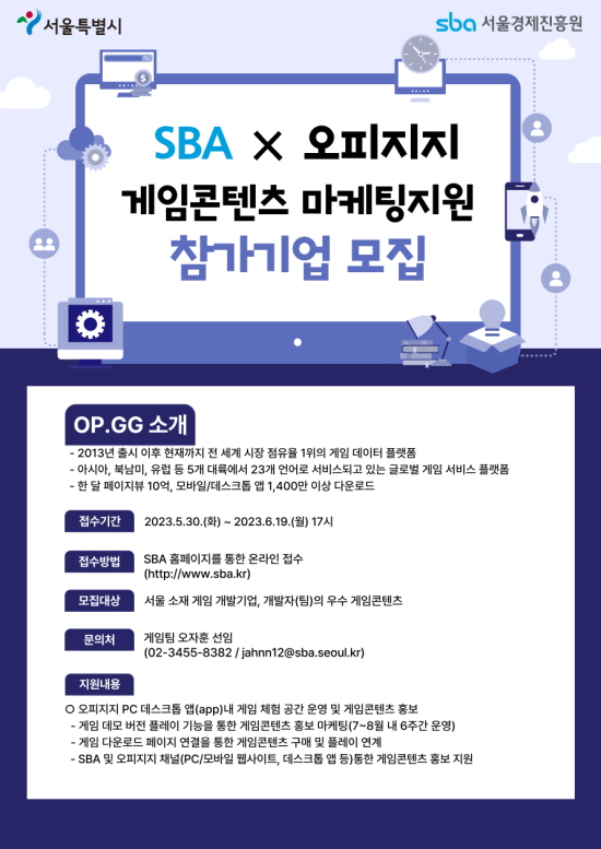 ±Û·Î¹ú °ÔÀÓ ¼­ºñ½º Ç÷§ÆûÀÎ OP.GG´Â ¿À´Ã ¼­¿ï½Ã¿Í ¼­¿ï°æÁ¦ÁøÈï¿ø(SBA)°ú Çù·ÂÇØ °ÔÀÓ ±â¾÷ÀÇ ½Å±Ô ¸¶ÄÉÆÃ Ç÷§Æû ¹ß±¼À» À§ÇØ ¡®SBA X OP.GG¡¯ °ÔÀÓ ÄÜÅÙÃ÷ ¸¶ÄÉÆÃÁö¿ø ÇÁ·Î±×·¥À» ÁøÇàÇÑ´Ù°í ¹àÇû´Ù.